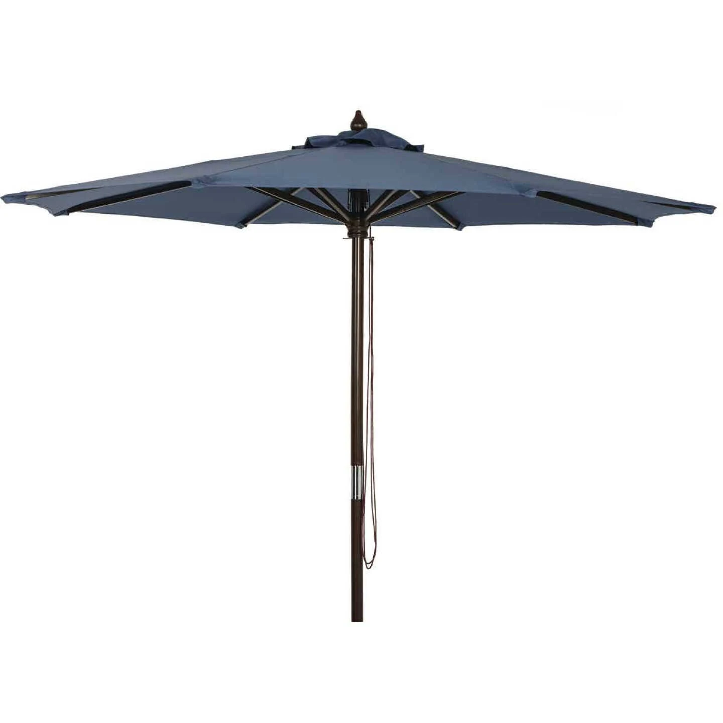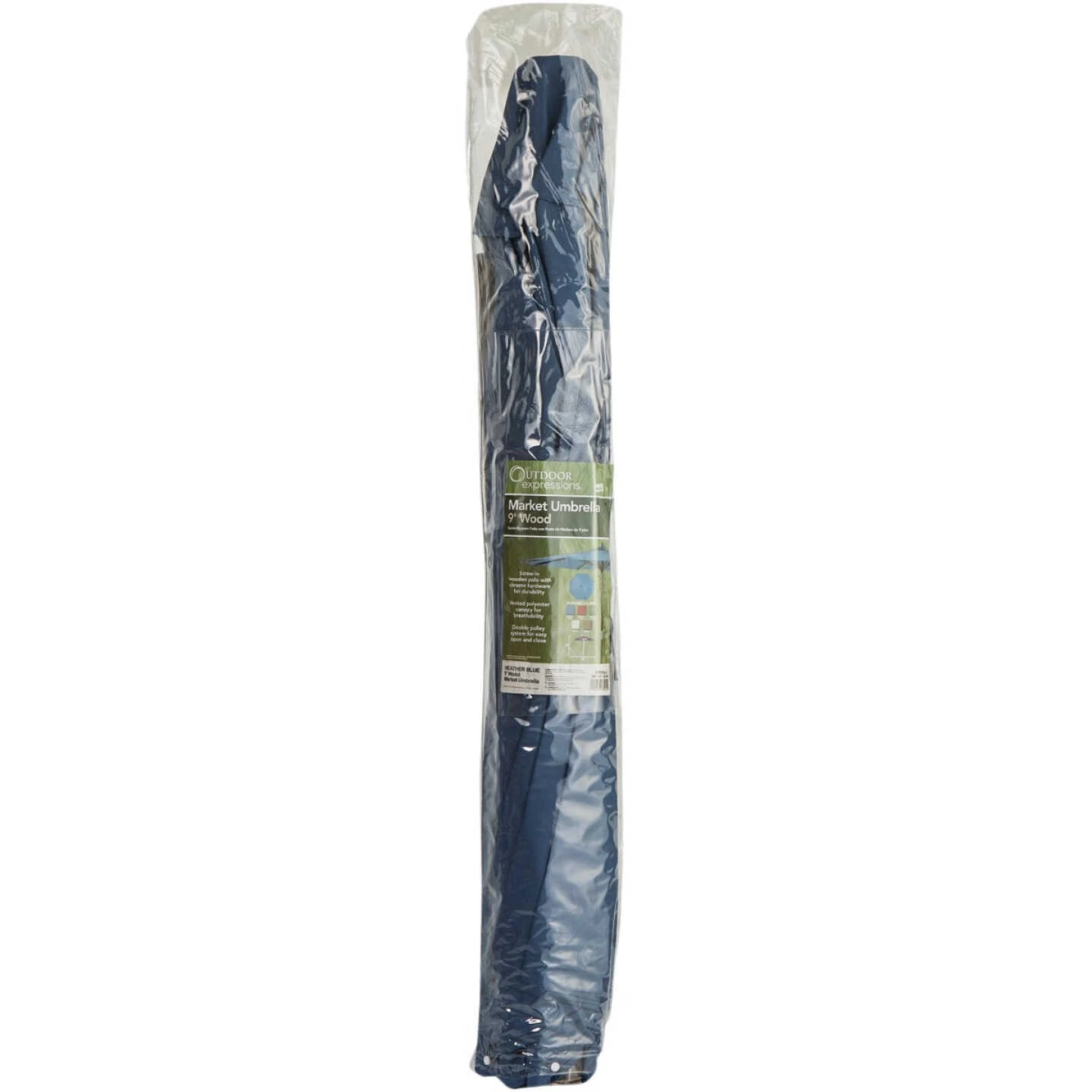 Decorative wood pole market umbrella. Features a durable polyester umbrella with 8 ribs and pulley system. Solid 7 Ft. 7 In. wood pole supports the umbrella. Vinyl storage bag included for convenient storage. 1-year warranty.